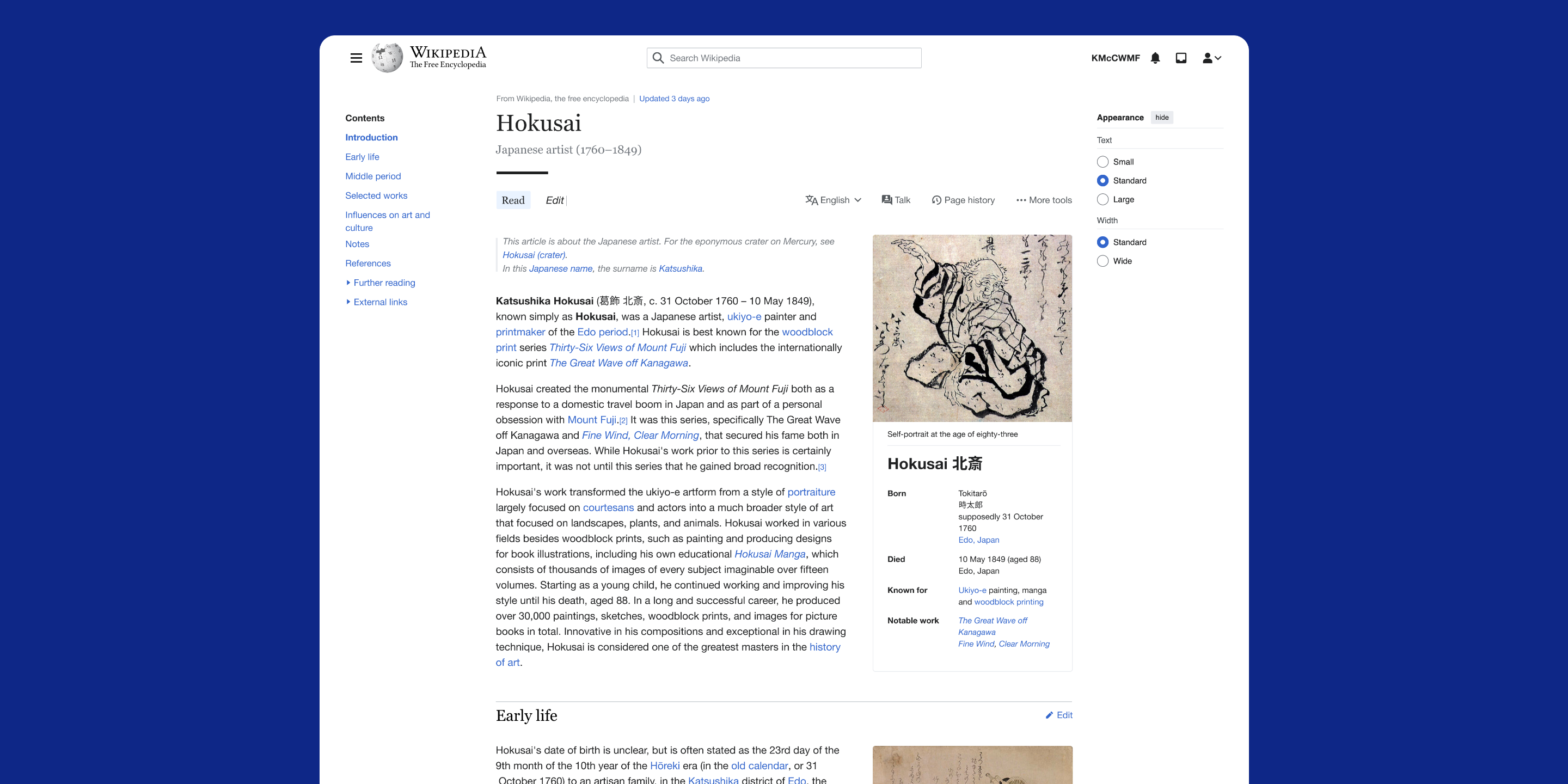 | Visual design exploration to improve the desktop reading experience. This work contributed to Wikipedia’s first major desktop interface update in twelve years. Read Wikimedia Foundation’s article on the project and my post on introducing a layout grid.
