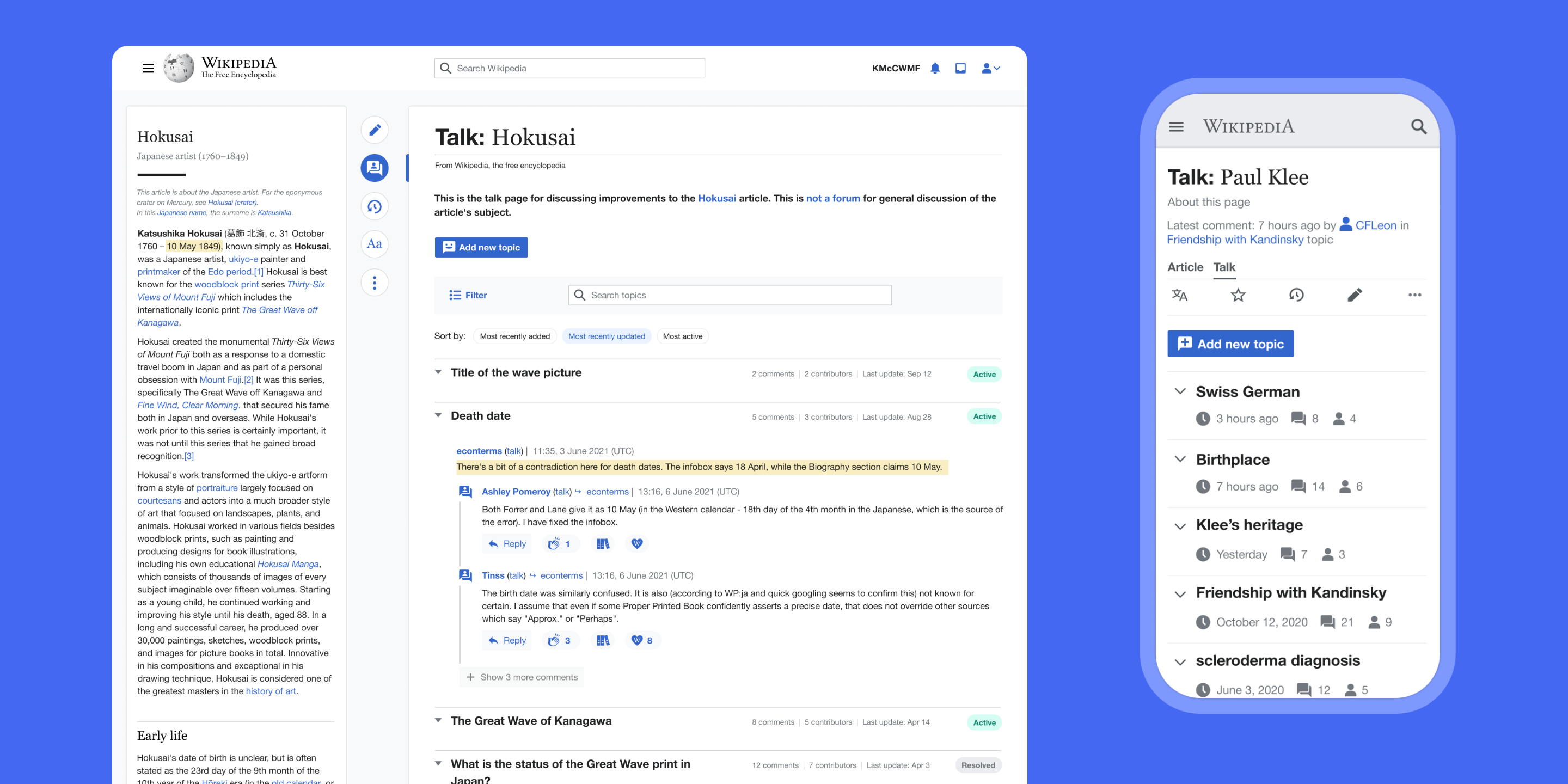 | Exploratory design work to improve Wikipedia’s article discussion experience and help engage a new generation of editors.